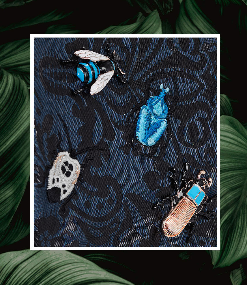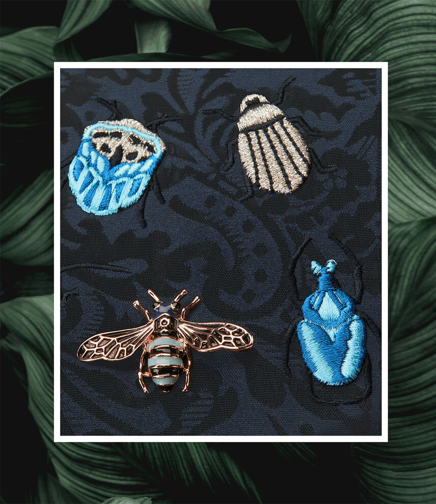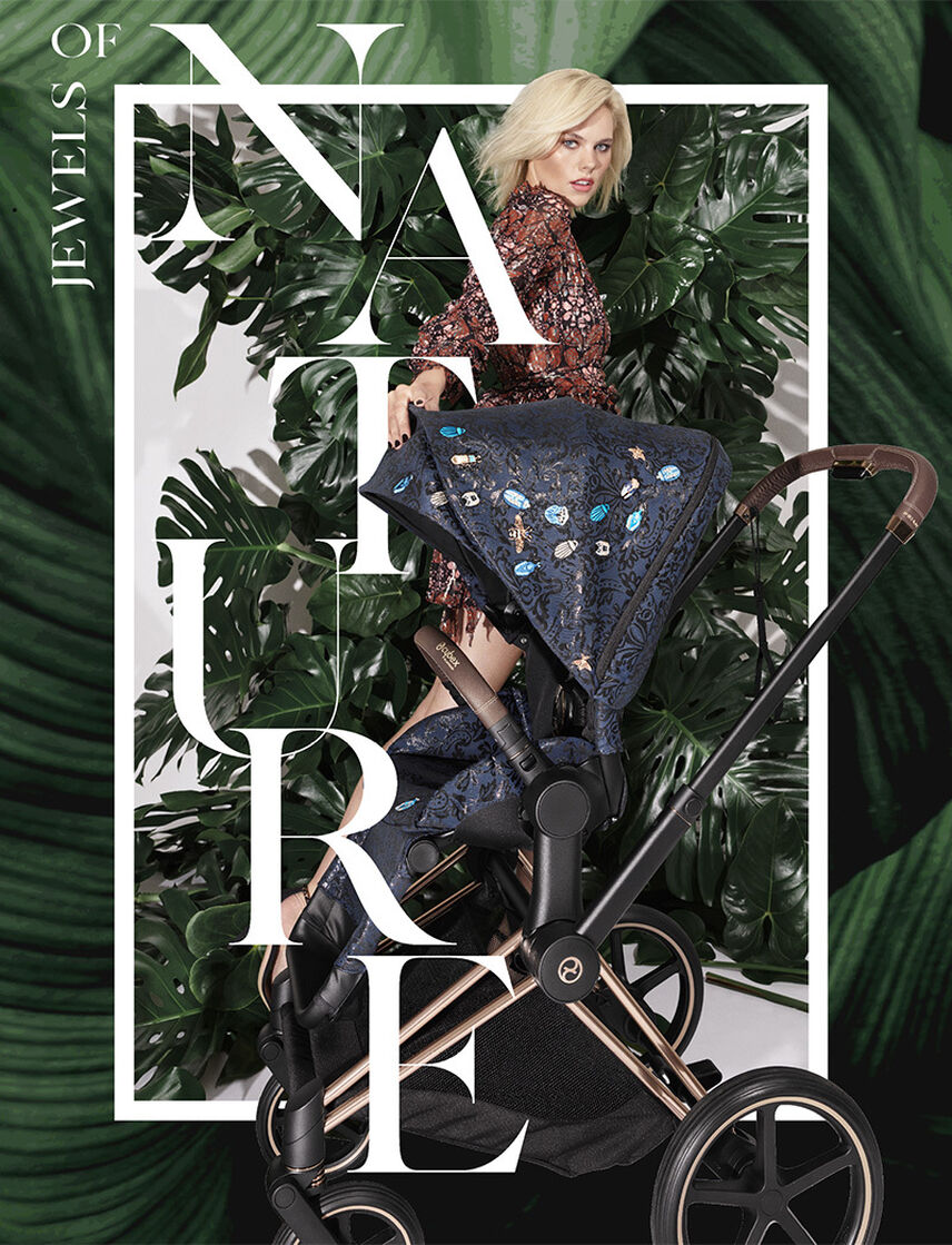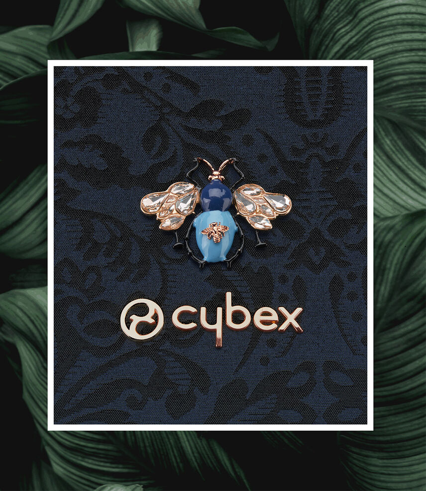 Los fascinantes detalles de escarabajo y el tejido bordado jacquard de la carriola de viaje Coÿa llaman la atención en cualquier destino.